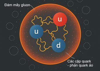 Bên trong proton/neutron, ba quark không hề tĩnh mà dao động liên tục, được gluon kết nối. Ngoài 3 quark chính, còn tồn tại mây gluon và quark ảo xuất hiện – biến mất liên tục.